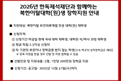 2025년 한독제석재단과 함께하는 북한이탈 보건의료 전공 대학(원)생 장학 지원 안내입니다. 1) 사업명: 2026 한독-Ifhme 건강한 통일 장학 지원 사업 2) 신청자격: 북한이탈 보건의료계열 전공 대학(원) 재학생 ① 신청기간 마감일 현재 국내 대학 재학생, 대학원 석/박사 과정 재...